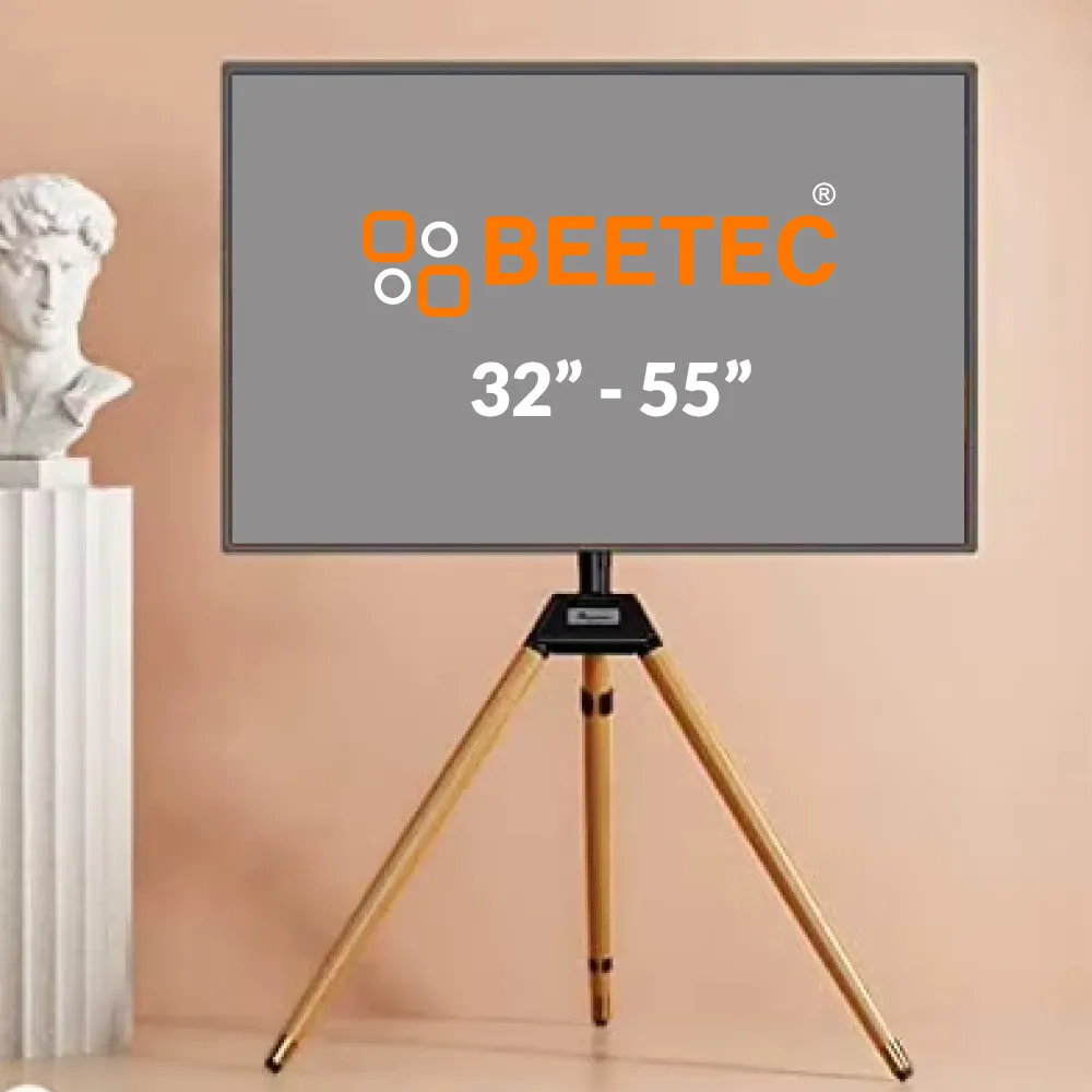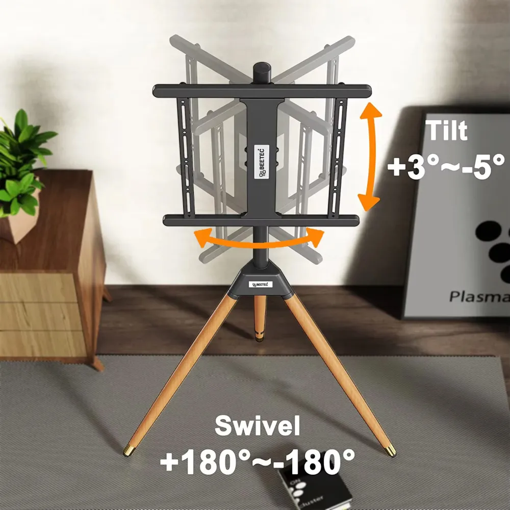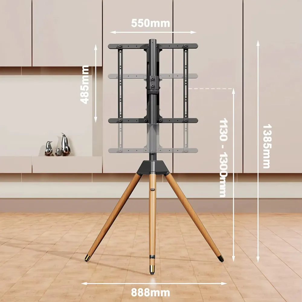 Achieve the ideal balance of style, flexibility, and ergonomic comfort with this premium TV stand. Its 180° swivel and +3° to -5° tilt ensure perfect viewing from any angle, while the height-adjustable frame (1130 mm – 1300 mm) reduces neck and eye strain. The sturdy wooden tripod base and sleek steel frame provide both stability and elegance, seamlessly fitting into modern interiors. Perfect for home, office, or exhibitions, this stand adapts to your needs for a dynamic and comfortable viewing experience.